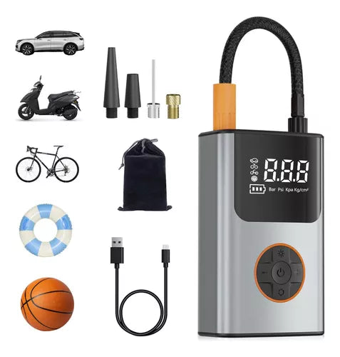 Compresor Digital de Aire Portátil CZK-3695: Ideal para inflar neumáticos en cualquier momento y lugar. Características: Diseño portátil y compacto, inalámbrico, batería de 2*2000mAh (14.8Wh), pantalla digital, luz de emergencia, indicador de potencia, presión máxima de 150 PSI, flujo de aire de 15 L/min, tiempo de inflado de 9.5 minutos, bajo ruido (<85dB), material de ABS y metal, incluye 4 boquillas adicionales. Beneficios: Fácil de transportar y usar, ahorro de tiempo, monitoreo de la presión de los neumáticos, diseño duradero, versátil para coches, motocicletas, bicicletas y balones de deportes. Especificaciones: Potencia 7.4V 80W, tamaño del cilindro 17 mm, peso 0.46 kg, certificaciones CE, RoHs, FCC, KC. Contenido del empaque: 1 compresor digital, 4 boquillas para inflar, 1 cable de carga tipo C, 1 funda protectora.